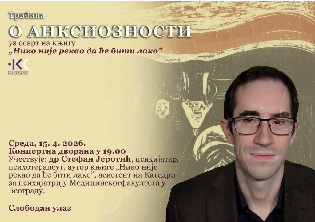 У среду, 15. априла од 19 часова, у Концертној дворани Центра за културу биће одржана трибина посвећена анксиозности – теми која се све чешће помиње, али се и даље недовољно разуме.