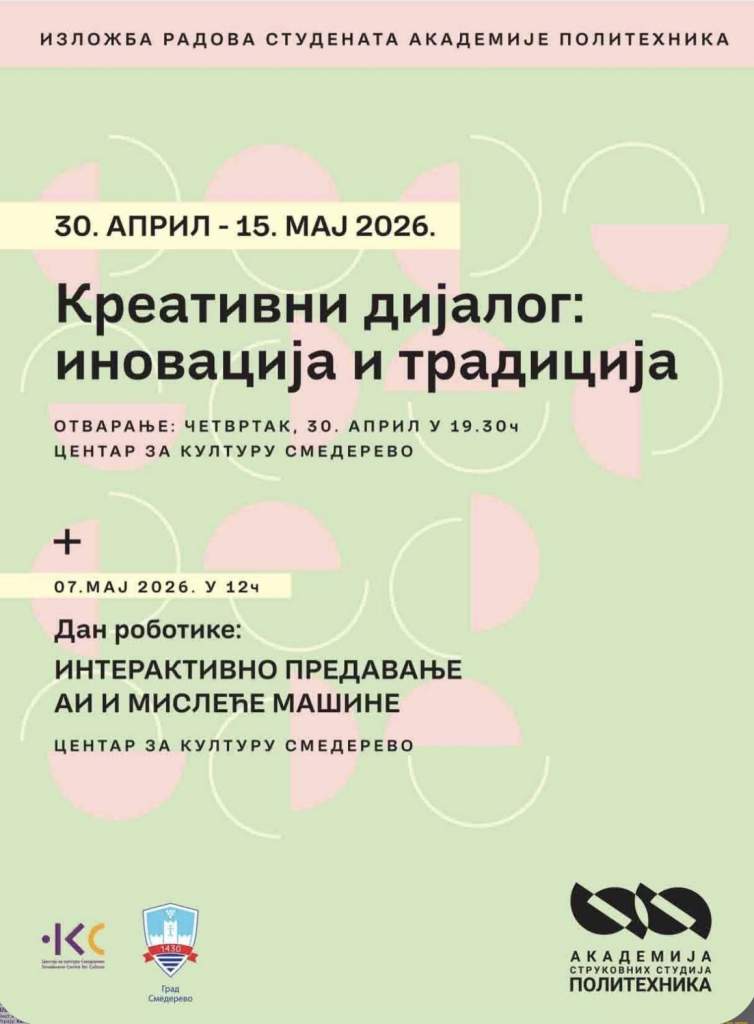У Центар за културу, вечерас у 19.30 биће отворена изложба радова студената Академија струковних студија Политехника, у оквиру пројекта „Креативни дијалог: традиција и иновација“.
