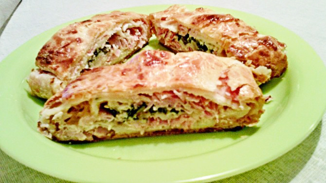 Овом смесом премазати целу кору, а касику-две оставити за премазивање пите. Печеницу исећи на коцкице и посути њом кору. На почетак коре сложити маслинке исечене на колутове и лишће першуна. Леви и десни крај дужине коре савити према средини, па кору ролати напред.