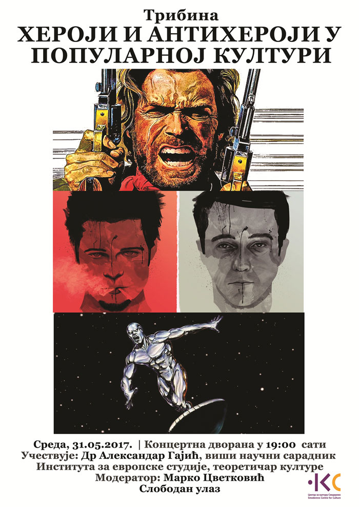 Проблемски приступ фигури хероја и антихероја, значењима које носе у области културног израза, вредносним и етичким позицијама са којима нас суочавају, биће афирмисан на трибини „Хероји и антихероји у популарној култури“ која ће се у Центру за културу Смедерево одржати у среду, 31. маја, са почетком у 19 сати. У разговору са др Александром Гајићем, вишим научним сарадником Института за европске студије, који се темом трибине бавио у истоименој студији популарна култура ће бити обележена као провокативно поље истраживања статуса херојског и антихеројског, јер кроз јунаке стрипа, филма и књижевности доноси приказ релативизације или губитка стабилних вредносно-моралних оријентира.
