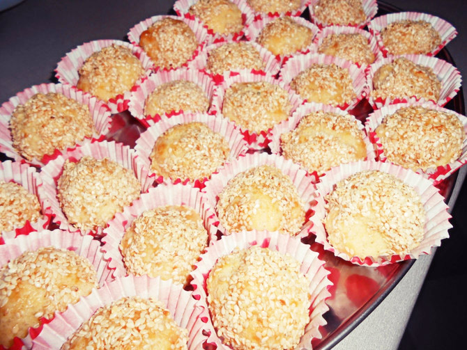 Изрендати качкаваљ, додати омекшали путер и брашно, рукама добро умесити и сјединити тесто да буде компактно. Одвајати делиће теста и утискивати у сваки део по једну маслину. Правити куглице. Уваљати куглице у беланца па у сусам и пећи на 200 степени око 35 до 40 минута у зависности од рерне. Обратити пажњу да сусам не прегори. У току печења излити вишак масноће коју пуштају куглице. Када су печене, стављати куглице на убрусе да упију масноћу.