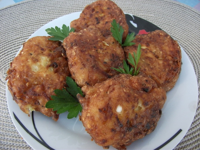 Тиквицу ољуштити и изрендати. Рукама оцедити вишак воде. Додати јаје, со, бибер, суви зачин, сир, брашно, прашак за пециво и сусам. Све лепо сјединити и пржити на врелом уљу.