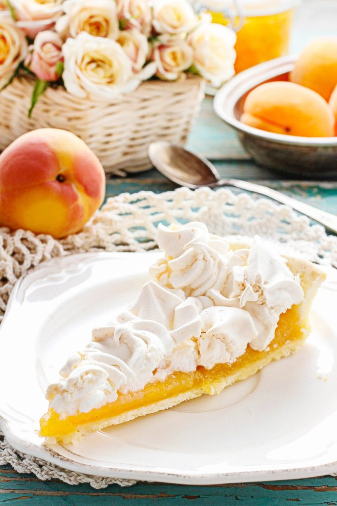 Одвојите беланца од жуманаца. Беланца умутите у чврст снег, додајте шећер и наставите да мутите док се шећер не растопи. У снег додајте жуманца, брашно и прашак за пециво, па добро промешајте да се смеса изједначи. Подмажите тепсију, наспите умућену смесу за кору и пеците је у рерни загрејаној на 200 степени око десет минута. За фил оперите и очистите брескве, затим их исеците на мање комаде, поспите их шећером и ставите да се кувају док се не згусну. Размутите пудинг од ваниле у пола литре воде да нема грудвица, затим наспите пудинг у брескве и наставите да кувате док се фил не скува и не згусне. Кору премажите филом од бресака и оставите колач у фрижидер да се добро охлади. Умутите шлаг по упутству са кесице и богато украсите колач.