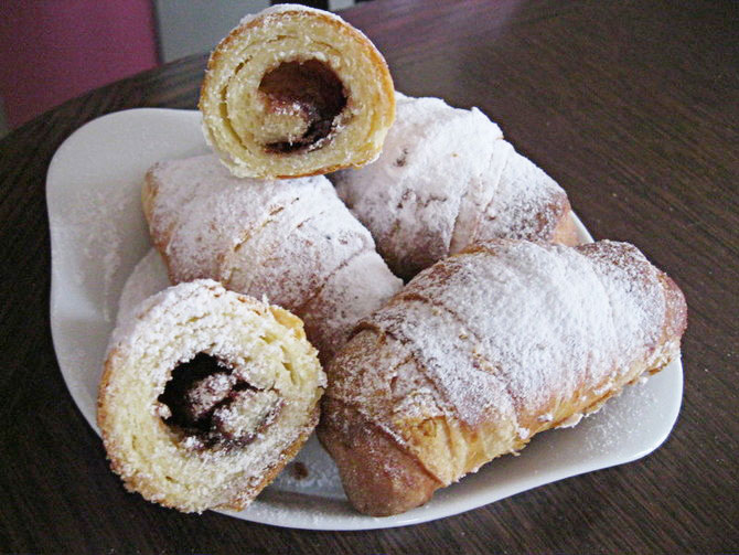 У млако млеко измрвити квасац, додати шећер и две кашике брашна, па оставити да нарасте. У ванглу за мешење сипати мало брашна, со, јаја и постепено додавајући нарастао квасац и брашно замесите глатко и меко тесто. Тесто оставите на топлом да нараста 20 минута. Нарасло тесто премесите и поделите на 15 лоптица. Сваку лоптицу развуците оклагијом на величину тањира и премазујте омекшалим маргарином. Ређајте једну преко друге тако да на 3 места буде по 5 развучених лоптица. Последње се не премазују маргарином. Сваки од ова 3 дела понаособ развуците оклагијом и ножем поделите на 8 троуглова. На сваки крај стављајте по кашичицу еурокрема и завијајте кифлице. Жуманца, воду и уље умутите виљушком и премажите преко сваке кифлице. Овако припремљење кифлице печите на 200 Ц око 35 минута док не добију златножуту боју. Печене кифлице поспите шећером у праху. Уживајте!
