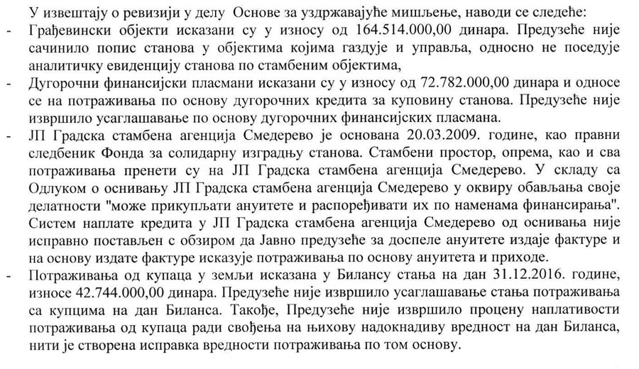 Градска стамбена агенција је у извештајном периоду остварила приходе од близу 65 милиона и расходе од 64,6 милиона. Пословни приходи су 102% плана и углавном га чини наплате услуге одржавања станова. Ево и дела налаза ревизора: (прилог 2.)