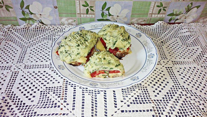 Месо ставити у науљен плех, поређати паприку, затим сир исечен на танко, па кромпир пире. Пећи на 200 степени око 15 минута.