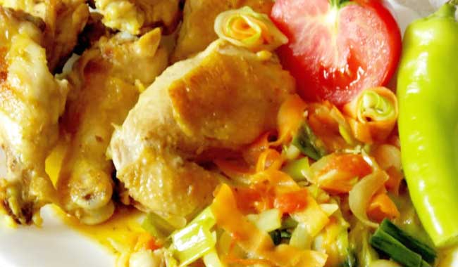Половину кокошке исеците на комаде, у сваки комад меса добро утрљати зачин са укусом пилетине, а затим премазати сваки комад пажљиво сенфом, оставити десетак минута да упије зачине.