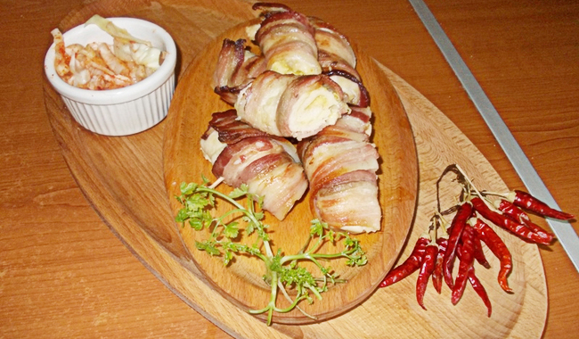 Пилетину исећи на шницле и истањити их тучком за месо. Посолити и побиберити по укусу. Унутрашњу страну меса премазати сенфом, па послагати качкаваљ исечен на штапиће. Месо затим уролати, те обмотати сланином исеченом на танке шните. Пилетину ређати на плех обложен папиром за печење, прелити маслиновим уљем и пећи у рерни на 200степени око 20- 25 минута.