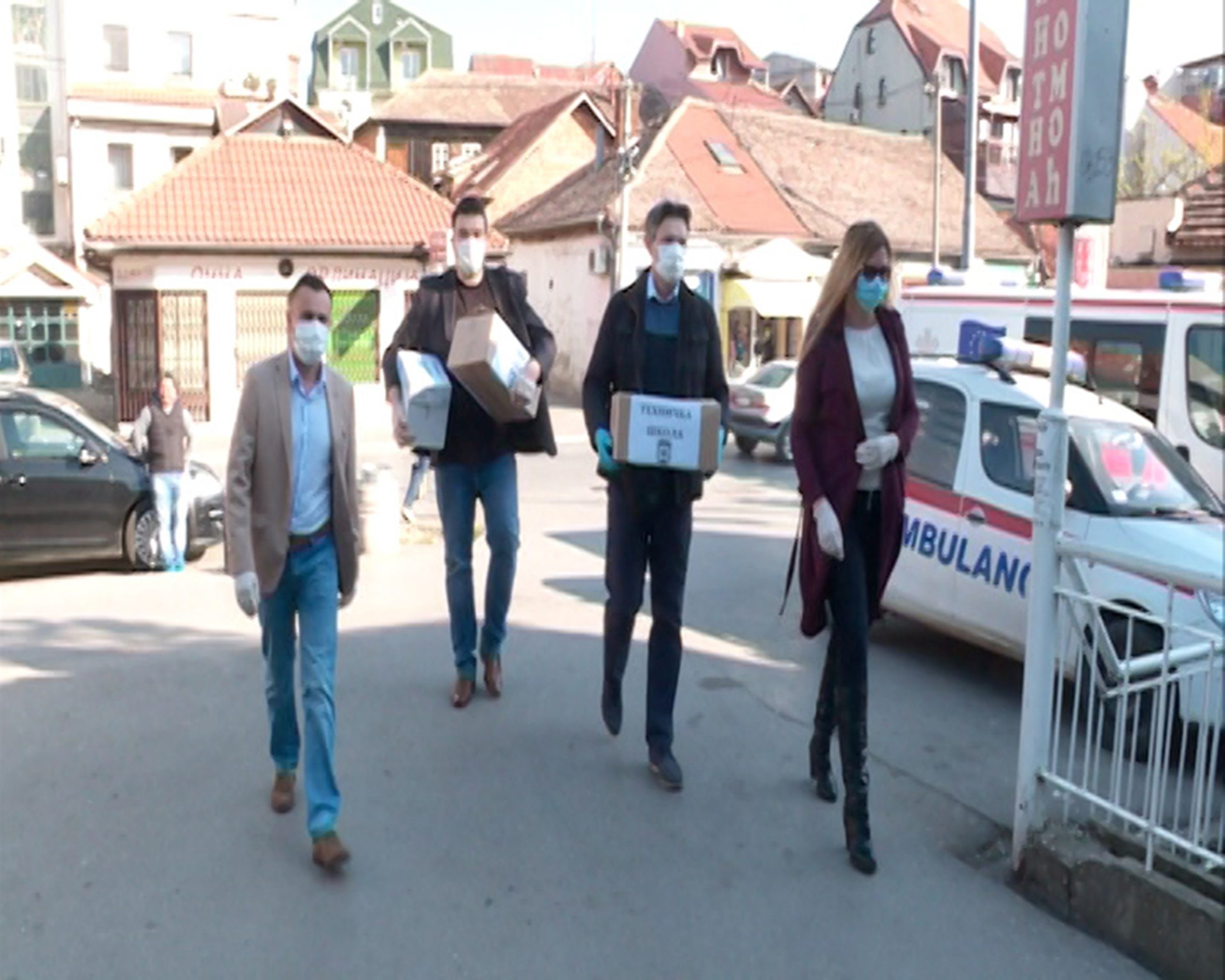 Примопредаја визира, према свим правилима понашања у време трајања ванредног стања, и под пуном заштитном опремом, али без визира, који су били у кутијама и који ће тек штитити главе здравствених радника обављена је испред хитне помоћи и улаза у респираторни центар, који се налази у згради дечијег диспанзера и који је повезан са АТД-ом у јединстсвену целину у којој се врши тријажа и дијагностика потенцијалних оболелих од КОВИД 19.