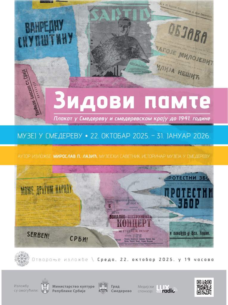 Музеј у Смедереву представља нову изложбу под називом „Зидови памте: Плакат у Смедереву и смедеревском крају до 1941. године“, аутора Мирослава П. Лазића, музејског саветника и историчара. Свечано отварање заказано је за среду, 22. октобар 2025. године у 19 часова, у првој сали Музеја у Смедереву.